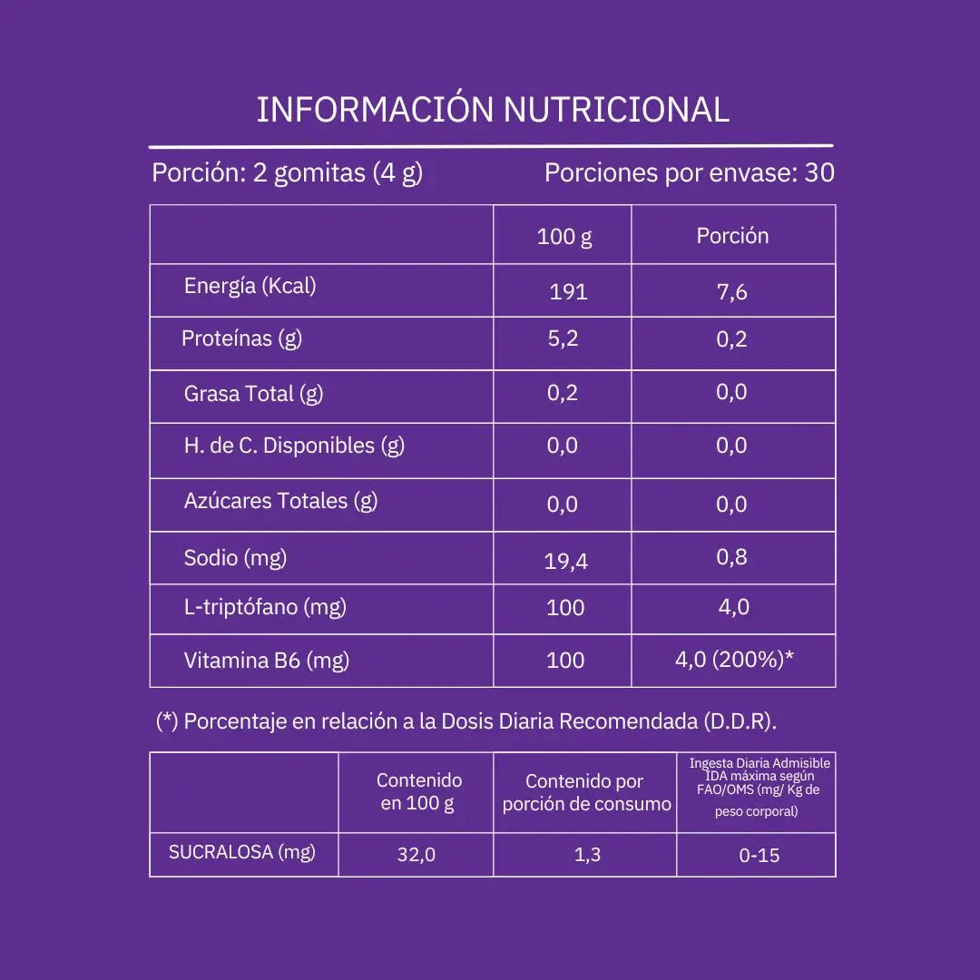 Ingredientes: Maltitol, isomaltitol, agua, jarabe de maltitol, gelatina, ácido cítrico, saborizante idéntico a natural, cera de carnauba, vitamina B6 (Clorhidrato de Piridoxina), L-triptófano, azul brillante FCF (E133), SUCRALOSA, colorante ponceau 4R (E 124), polidimetilsiloxano (E 900).