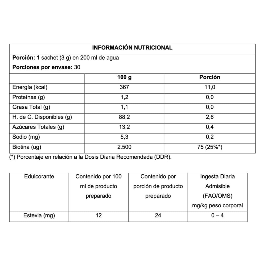 Dosis diaria recomendada: 1 porción al día. Consumo máximo 1 sachet por día.